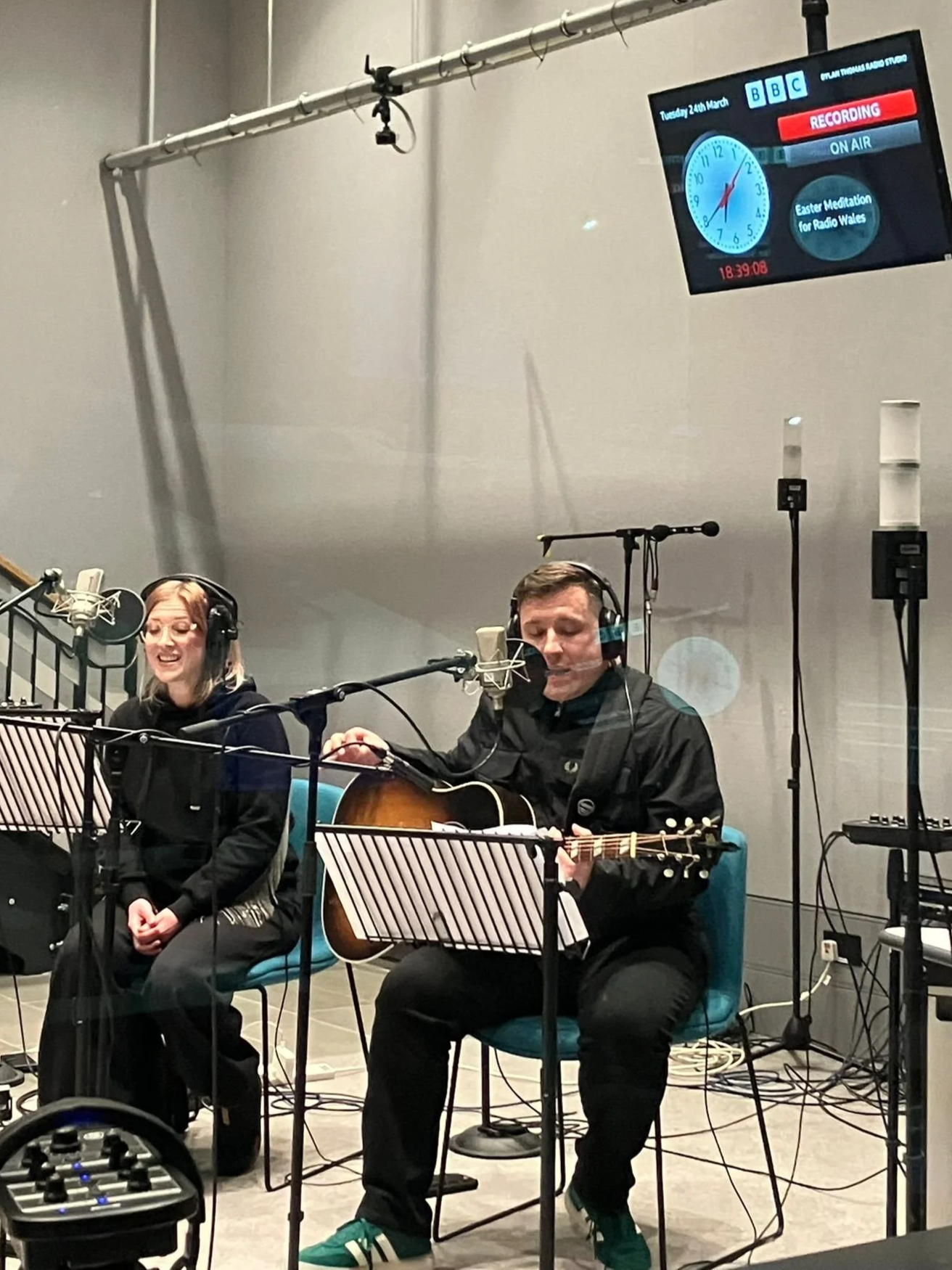 Sibblings Kate and Rob Westall recording at the Dylan Thomas Drama Studio at BBC Radio Wales in Cardiff.
