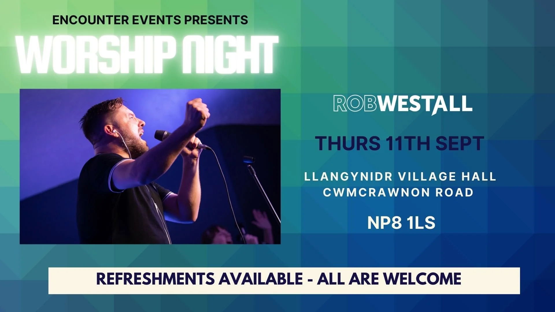 Christian recording artist & worship leader Rob Westall will be leading an evening of worship at the Threshing Barn at Middle Gaer Farm in Cwmdu on Thursday 11th September 2025 at 7.30pm.